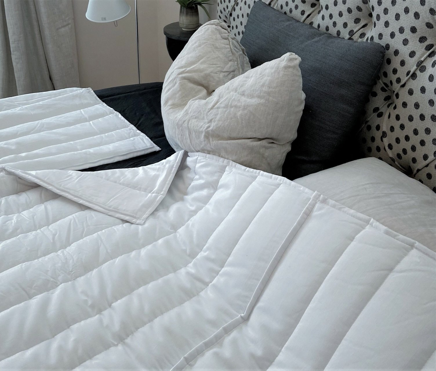 Tyngdtäcket i dubbel bredd består av tre separata delar om 4 kg vardera. Det den totala vikten på täcket är 12 kg, men täcket genererar en tyngd motsvarande ett 8 kg enkelt tyngdtäcke. Täcket har en vaddering på ena sidan vilket gör det lämpligt för er som vill ett normalvarmt tyngdtäcke.