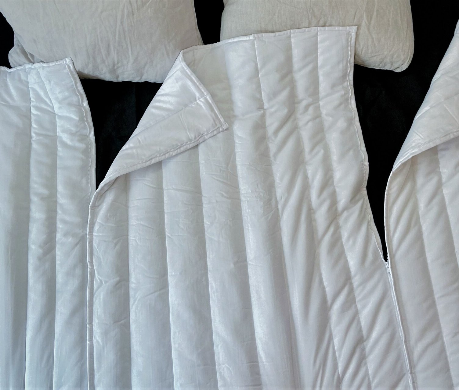 Med hjälp av dragkedjor separeras täckets tre delar vilket gör att det kan tvättas och torktumlas i vanliga hushållsmaskiner.